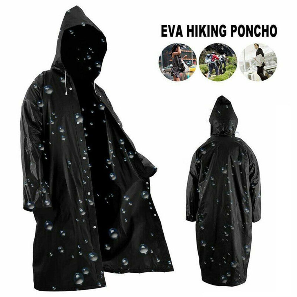 Material: made of high qualitu EVA, lightweight, waterproof and quick-drying, packable, skin-friendly and comfortable to wear.Size: One Size; length 115cm/45.27 inch, sleeve length 80cm/31.5 inch, chest 130cm/51.2 inch, hood height 30cm/11.81 inch.Knee length jacket, long sleeve, button closure design, Solid black stylish look, simple and match well with all your outfit.The windproof drawstrings at 2 sides of the hood can make the raincoat stay fixed on the head.Suitable for daily wear, camping, hiking, cycling, walking, traveling, walking the dog or other outdoor activities.