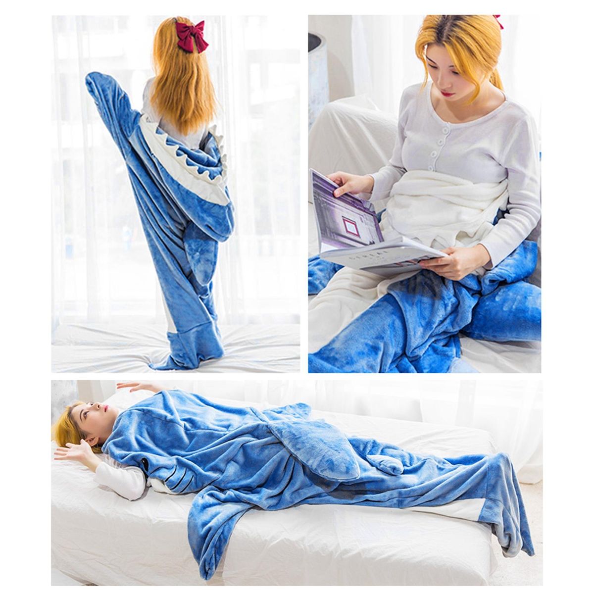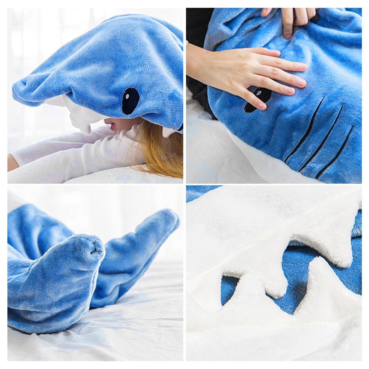 The hoodie sleeping bag, a versatile and fun accessory suitable for both adults and children. this unique shark-shaped wearable blanket is designed to help you get into character every time you put it on. with realistic prints and classic colors, it adds a touch of excitement to your everyday life.