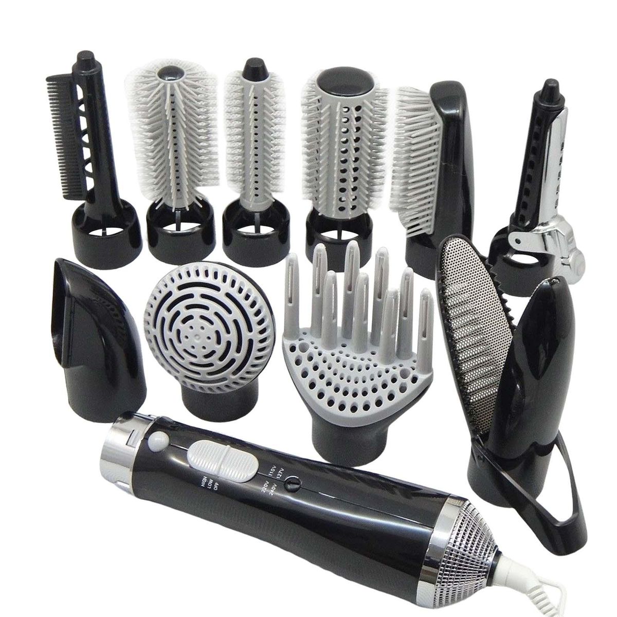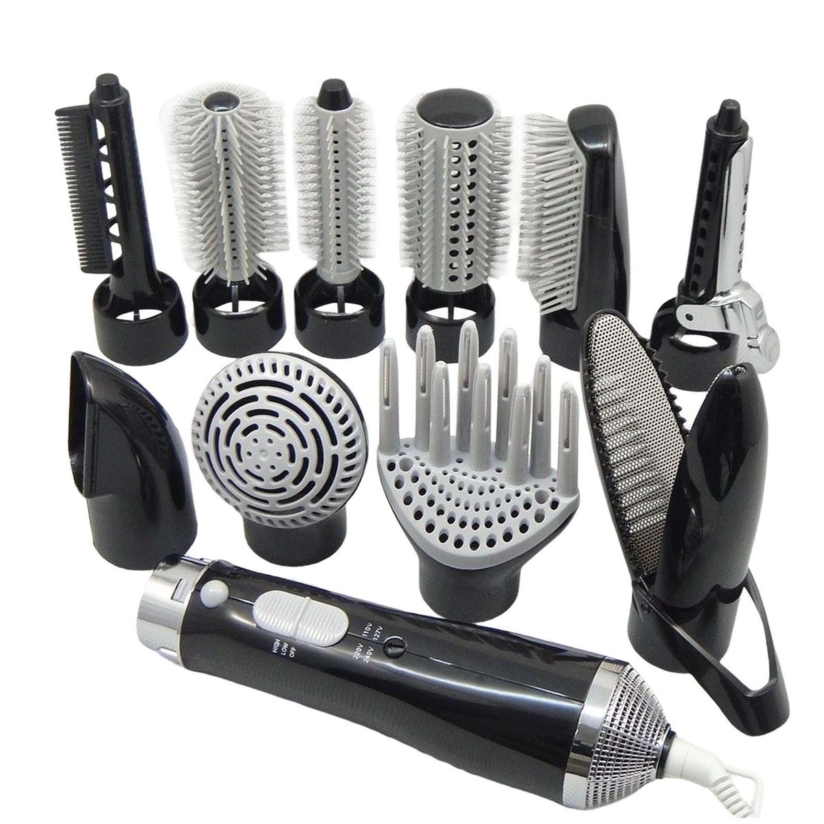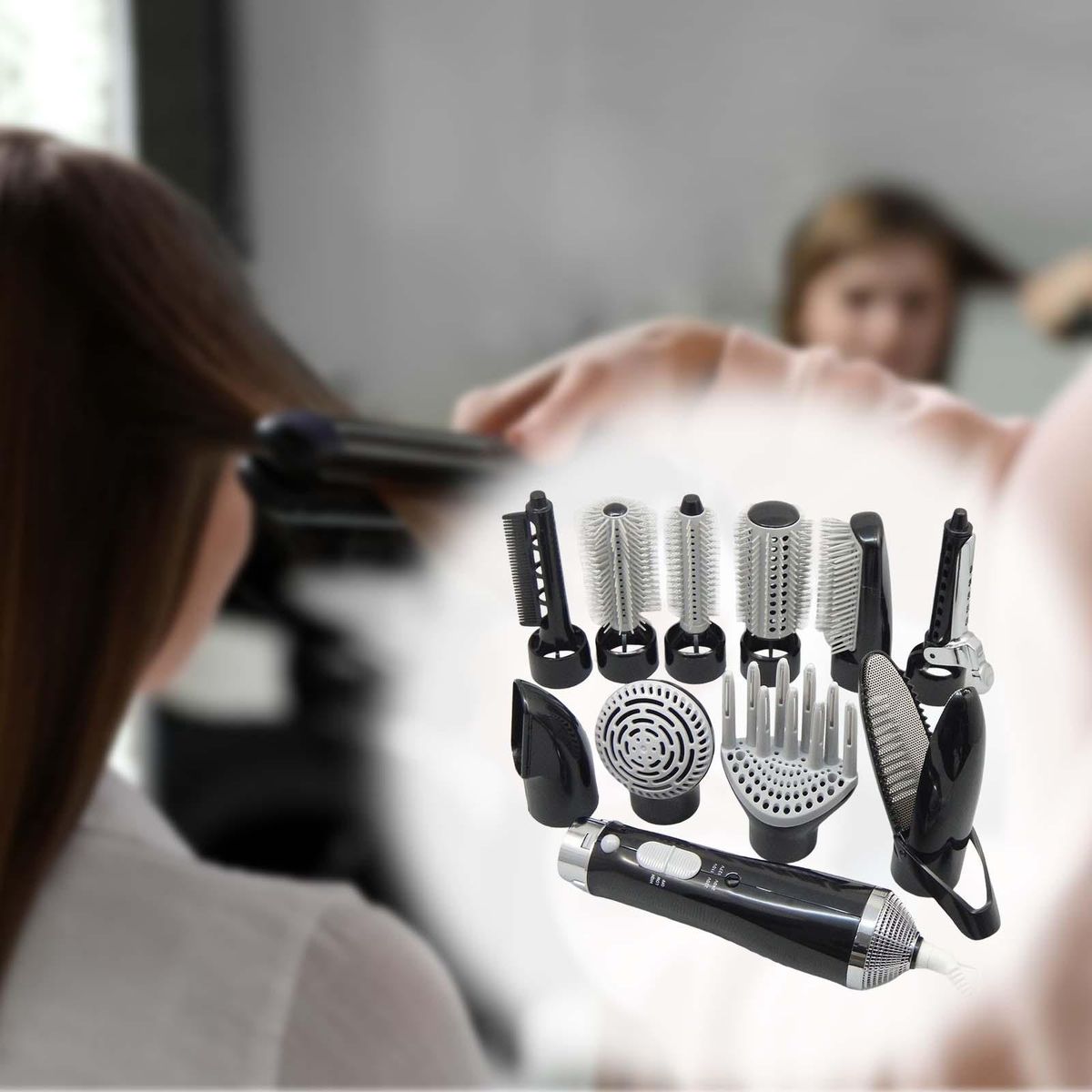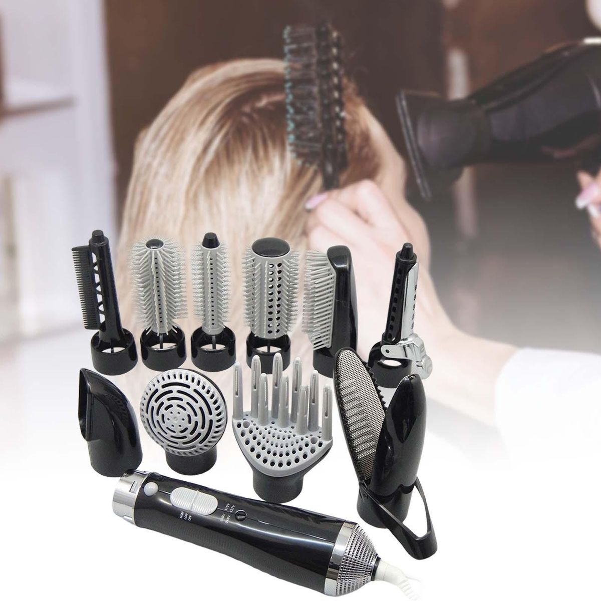 Packing List: Multifunctional hair dryer brush set includes 1pc host, 1pc blow drying brush, 3pcs large, medium and small curling comb, 1pc hot air perming clip, 1pc detangling comb, 1pc volumizing comb, 1pc collector nozzle, 1pc comb, 1pc diffuser nozzle.