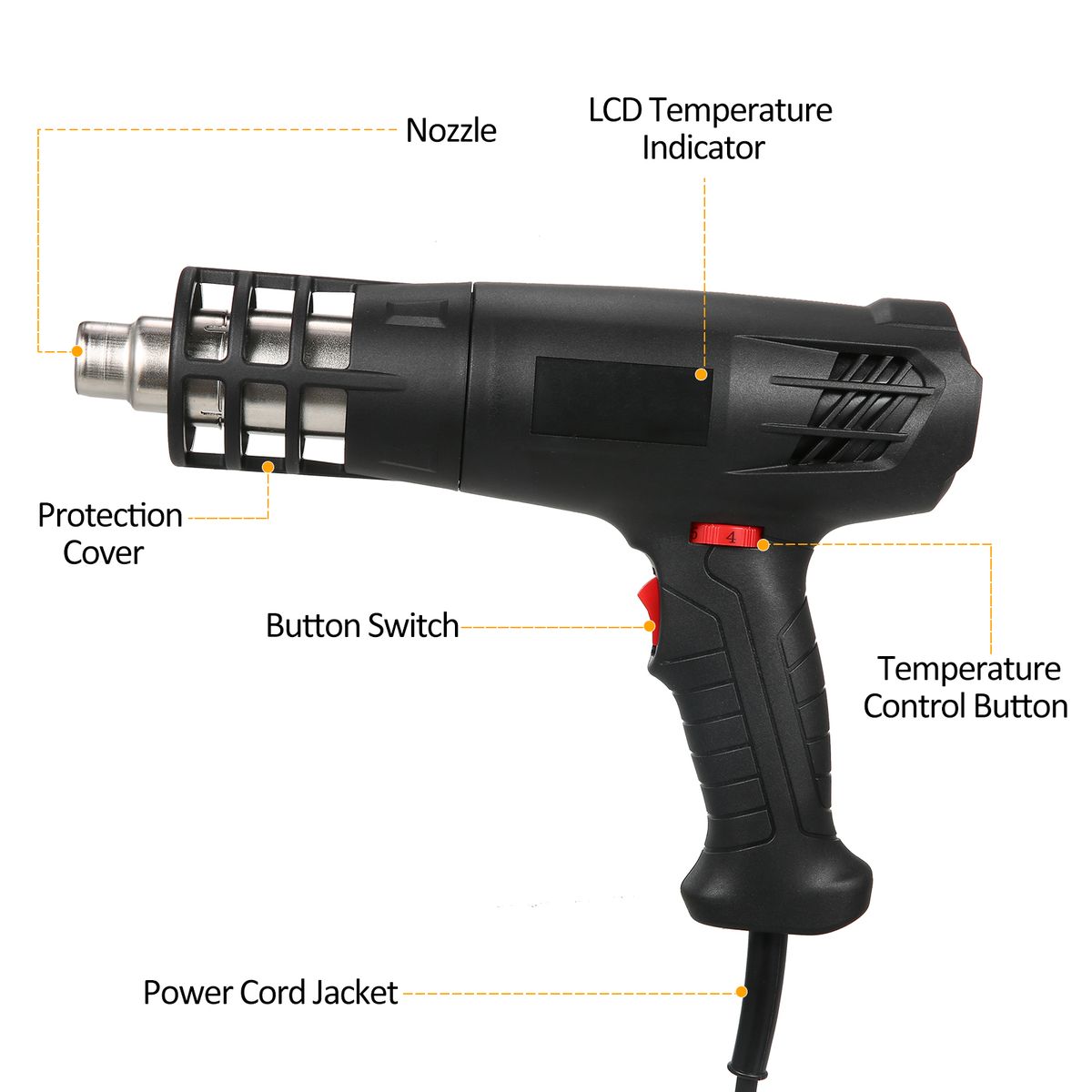 【Four Nozzles Accessories】 Deflector nozzle directs a long, narrow heat pattern to the work surface; Two concentrator nozzles direct a concentrated heat flow to the work surface; Reflector nozzle disperses heat flow evenly around the whole work surface.