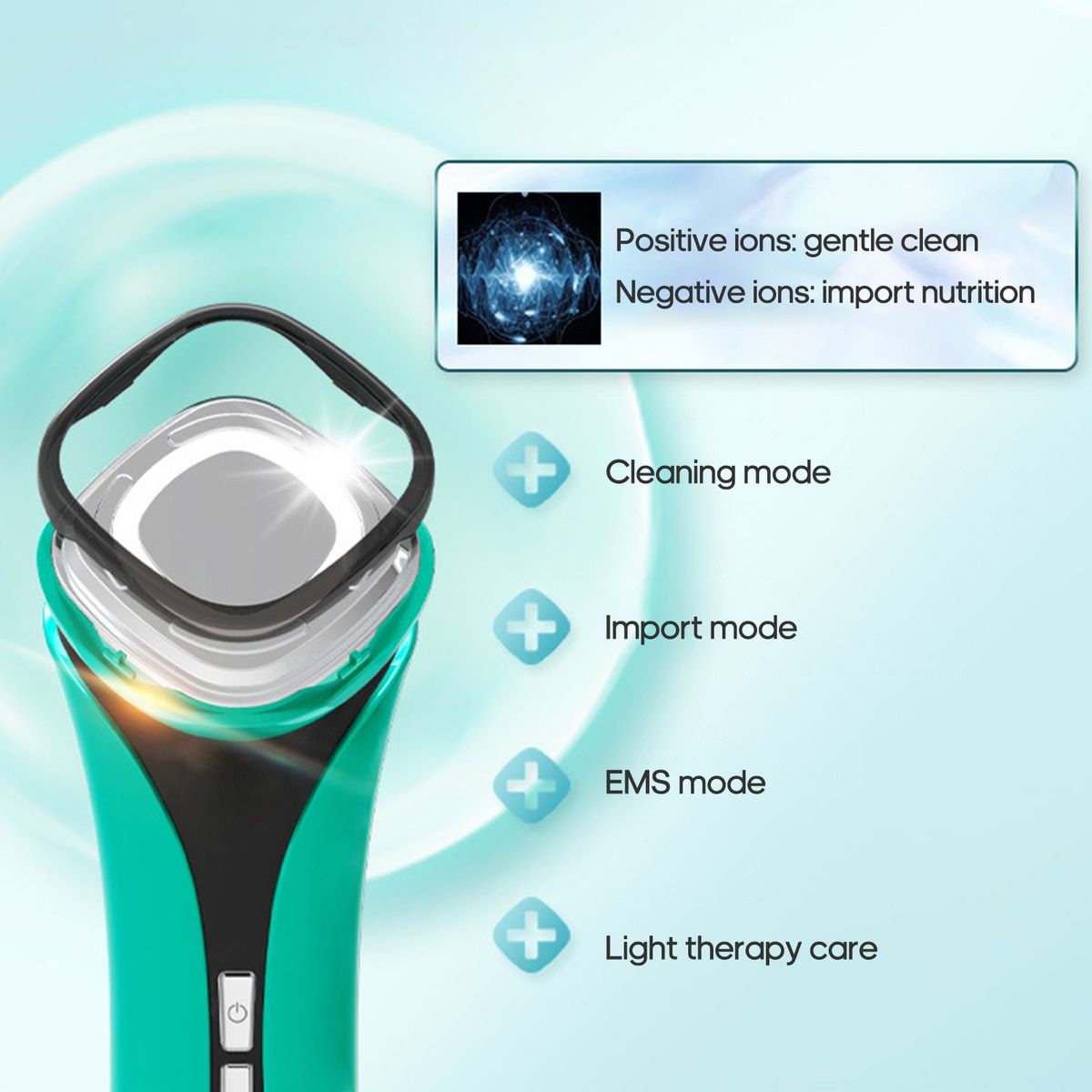 Positive ions gentle clean, negative ions import nutrition. Cleaning mode, import mode, EMS mode, light therapy care.