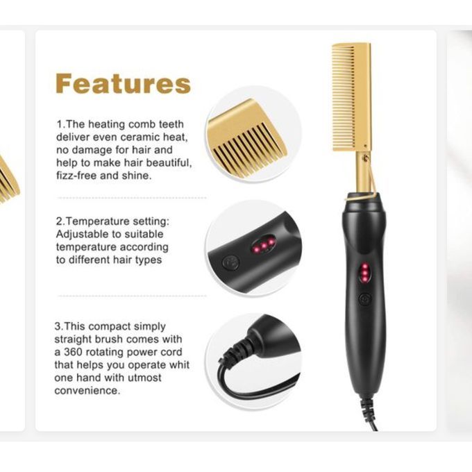 Gender: Man & WomanItem Type: straight hair Beard Style combColor: different coloursOptimal styling time: Less than 1 min.Power Cord Tail Assembly Mode: 360° RotatableMax. temperature: 210°CVoltage: 100-240v (Dual voltage)Frequency: 50/60HzPower: 60W-100WPower Source: ElectricMin. temperature: 120 °CDisplay: LED indicatorPlug type: EU.US.UK(Add adapter).AU (Add adapter)Service life of thermal plate/bar: More than 50,000 timesMaterial of thermal plate/bar: Tourmaline ceramicUser: Salon and household both men&womenSize:200*35mm*30mmItem weight : 0.35kgWhat's in the box1*straightener hair Styling comb