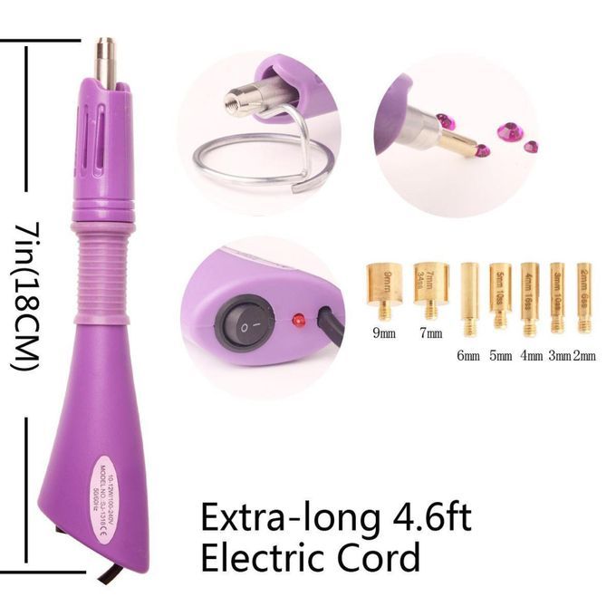 High quality and durable to use, with a safety stand and 7 different applicator tips for applying different sized hot fix cystals.