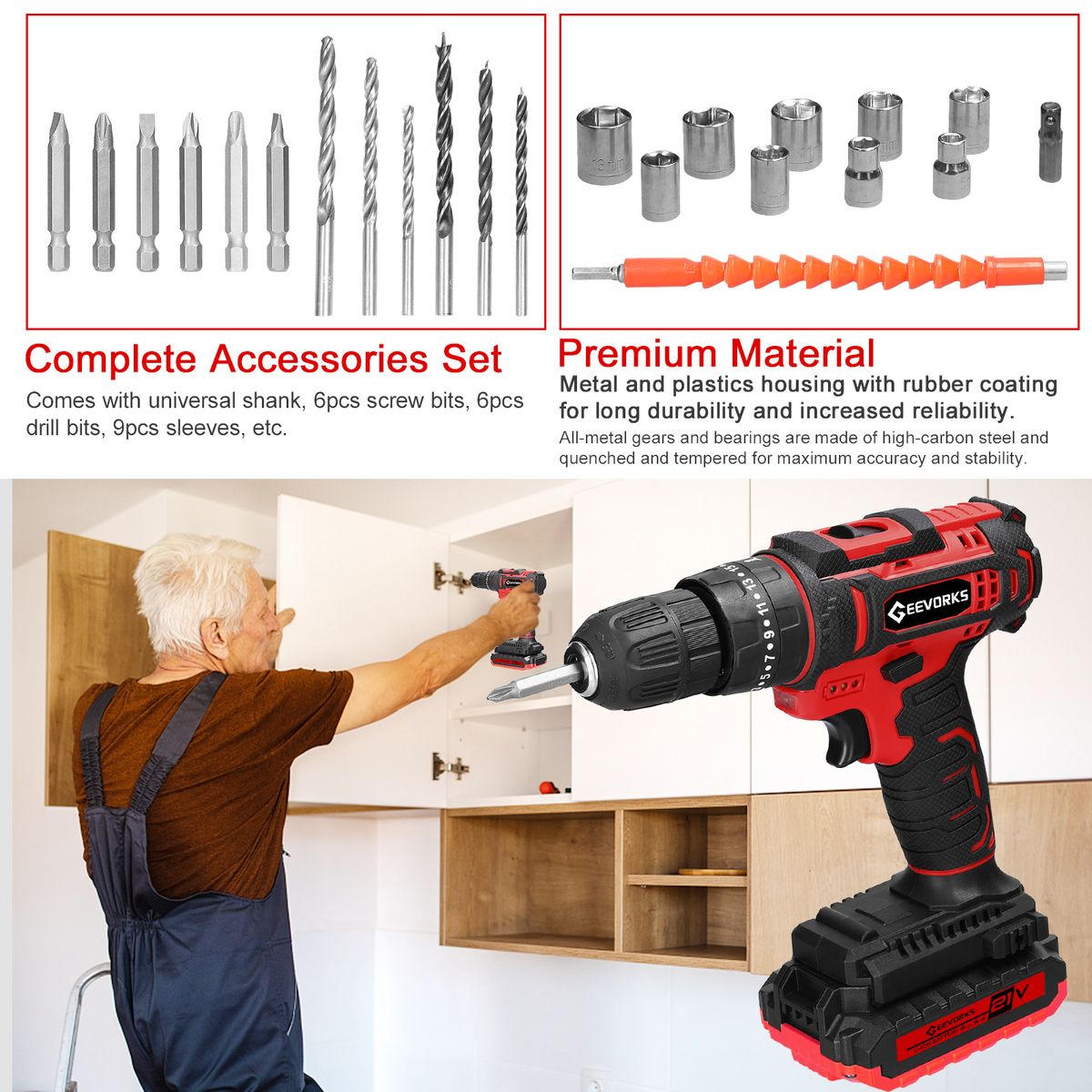 【Complete Accessories Set】: Comes with universal shank, 6pcs screw bits, 6pcs drill bits, 9pcs sleeves, etc. Self-locking chuck tightens as you work to provide greater bit retention, and this construction provides added higher durability.