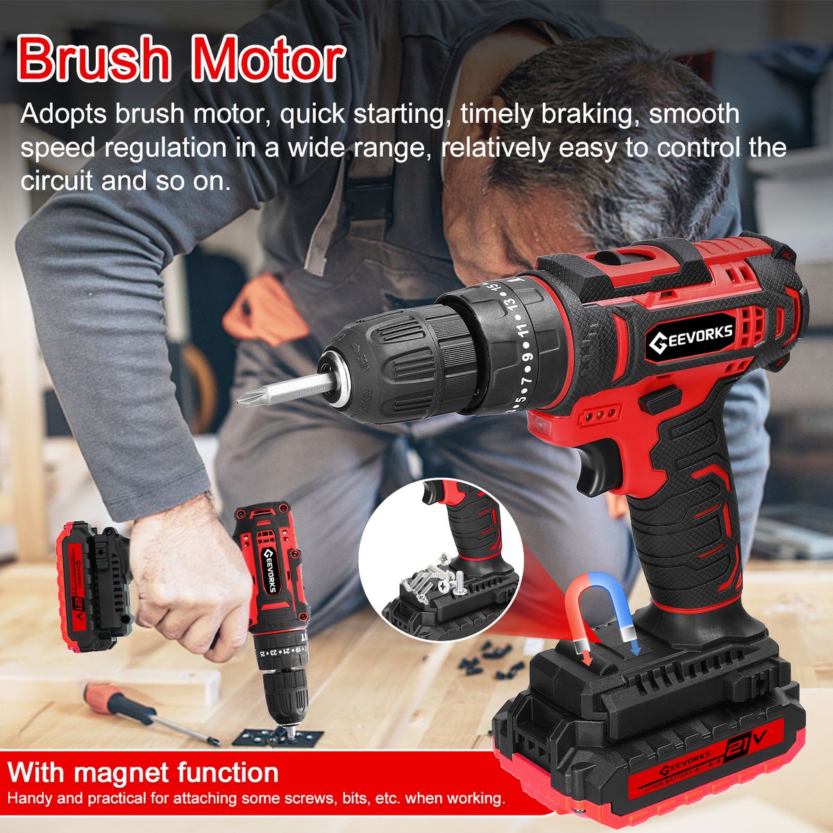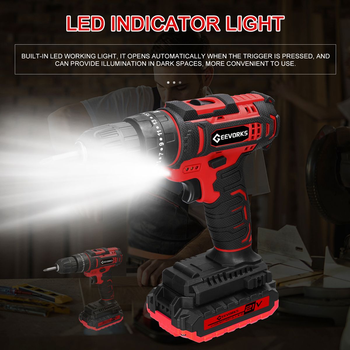 The electric drill adopts 3in1 design, forward and reverse rotation direction adjustable, and with trigger lock function, easy to disassemble and assemble. Multifunctional, 25 + 3 stage settings, provides 25 torsion settings and 3 working modes, can satisfy with all your demands. Ergonomic anti-slip handle design, easy to grip and with comfortable hand feeling, practical and labor-saving. Suitable for construction site shelves, maintenance, woodworking, etc. With LED working light, provides illumination in dark environment. Wide applications, suitable for construction site shelves, maintenance, woodworking, etc.