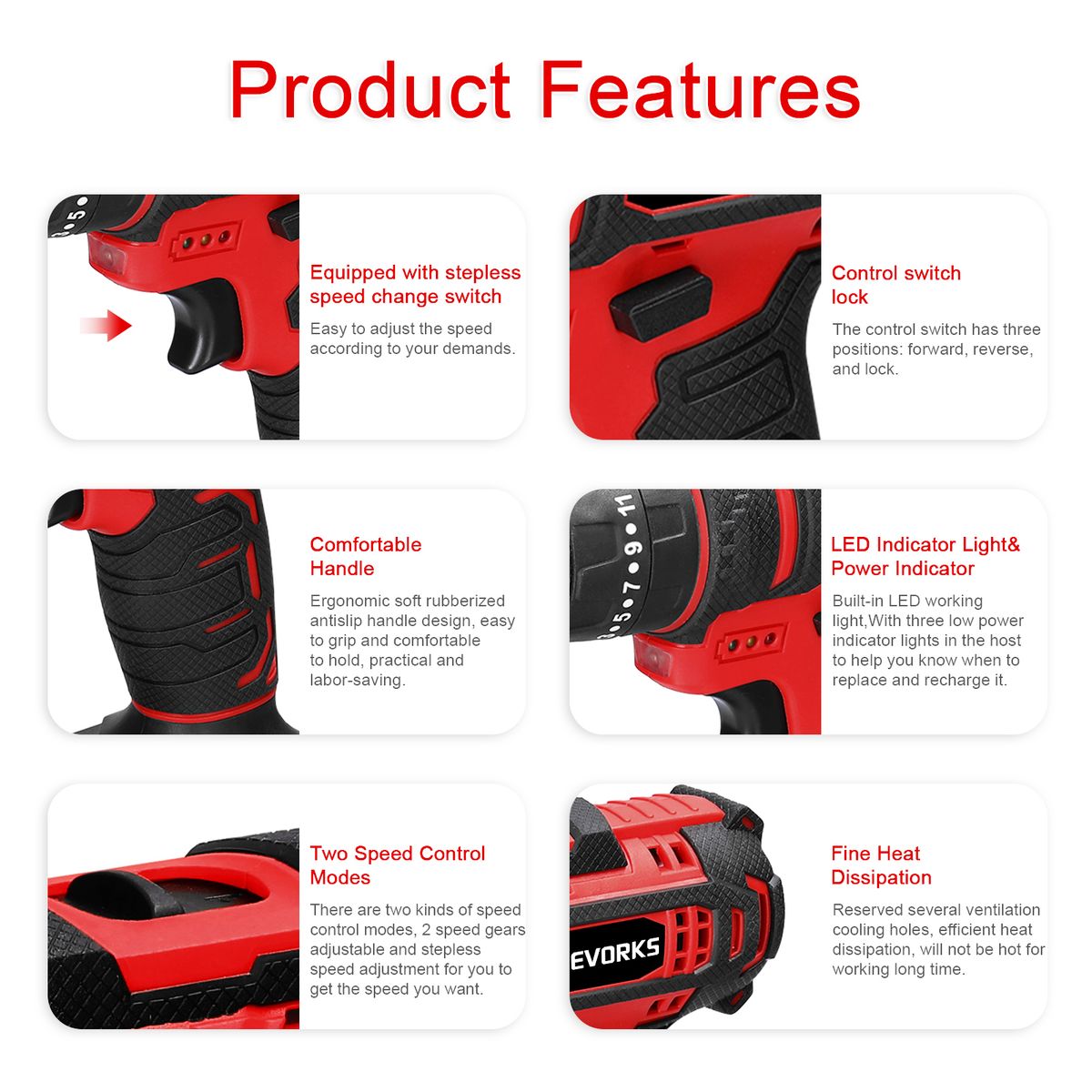 【Two Speed Control Modes】: There are two kinds of speed control modes, 2 speed gears adjustable and stepless speed adjustment for you to get the speed you want. Equipped with stepless speed change switch, easy to adjust the speed according to your needs. To vary the working speed, simply increase or decrease the pressure on the trigger, the greater the pressure added, the higher the speed is.
