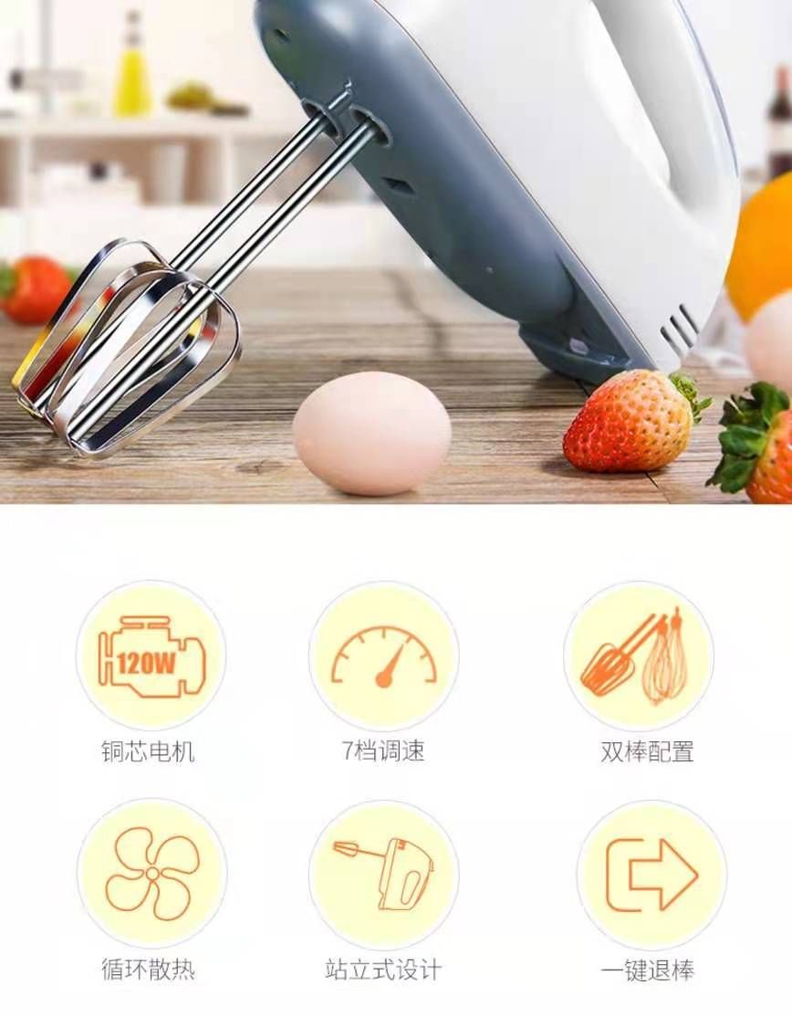 multi-functionBeat egg headWhisk the egg whites and and butter and jam and batter and batterMulti-function eggbeaterGood Baking Helper7 speed whip eggs, cre, butter, chocolate, flour, seasoning120Copper motor7 gear speedTwin rod configurationCirculating cooling stand - up designA key rodExquisite and chic take at willBeater sharpener baking really give power, save worry more effort.Exquisite and chic take at willBeater sharpener baking really give power, save worry more effort.Vertical designNot afraid of soiling the tableBake to make a little happiness, love them well hold their stomach!Strong driving forceProtein instant killingThe master baker has it much easierMake your own healthy food and enjoy the peace and quiet of solitude.Evaluation (60+) ordering instructionsRich cake delicious custard tartNutrition toastStir chocolate sauce, make chiffon to beat eggs, stir flour to beat butter to make delicate cakes, classic flavor.To make a smooth egg tart.Soft toast.Dual bar stirring/multi-great configuration304 stainless steel wire rod for food contactWhirlwind egg, double efficiency, reduce to kill time.Four - dimensional mixing bar 12 line barFour-dimensional mixing barCan mix flour, spices and other ingredients, stir , mashed potatoes, jam and other mushy ingredients.Hold an egg whisk at home