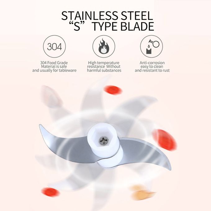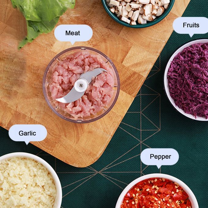 This food chopper is equipped with two sets of food grade 304 stainless steel blades, which can quickly and reliably cut food by pressing the button. It is very suitable for small work, such as chopping garlic, ginger, pepper, carrot, vegetables, onion, nuts, etc.