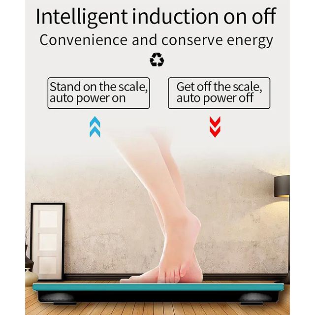 Intelligent automatical on-off design is more energy-saving. The scale would turn on immediately when you step on it, and turn off when no body is on it.