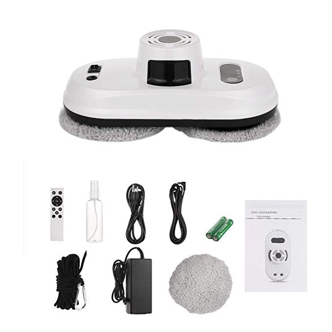 3. Packaging contents: 1x intelligent window cleaning robot, 1x remote control, 1x power adapter, 1x power cord, 1x sprayer, 1x safety rope with hook.