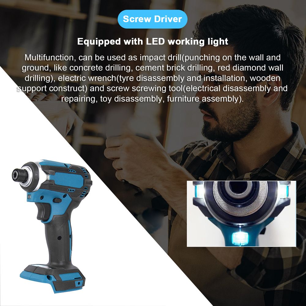 Multifunction, can be used as impact drill(punching on the wall and ground, like concrete drilling, cement brick drilling, red diamond wall drilling), electric wrench(tyre disassembly and installation, wooden support construct) and screw screwing tool(electrical disassembly and repairing, toy disassembly, furniture assembly).