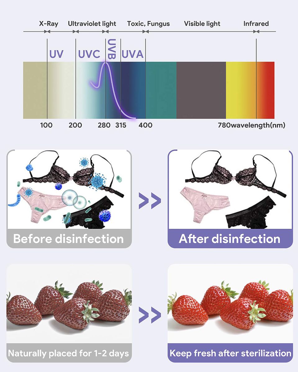Fast Sterilization --- 254nm UV Wavelength, High powerful, quickly destroy the DNA or RNA molecular structure of microbial body cells through UV dis-infection. UV light sterili-zer can kill most bad particles.