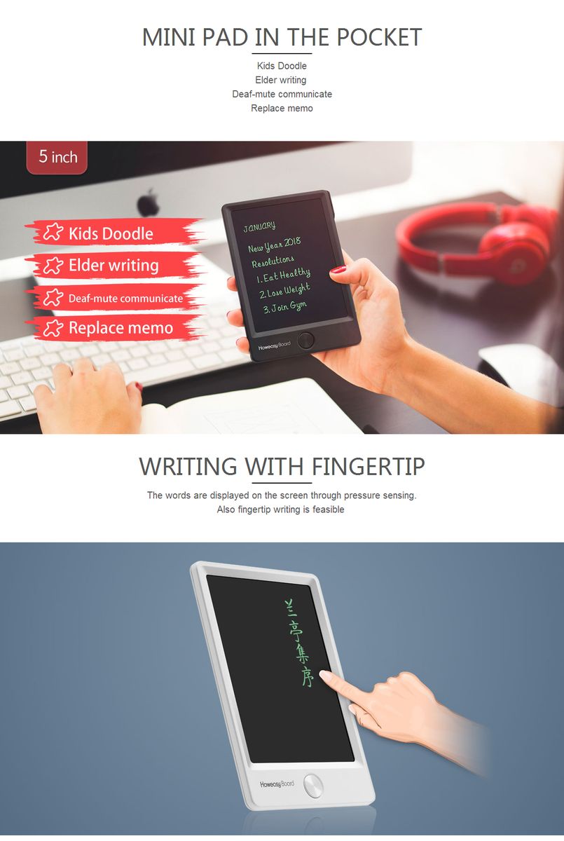 PRODUCT FUNCTIONS FEATURES:◆ PORTABLE: 4.4 inches of writing area, ultra-slim, compact, and lightweight design fits easily in a purse or pocket, easy to carry and use in everywhere.◆ EASY TO USE: Writing and drawing on the tablet is just like on the paper, you can use the plastic stylus attached or your fingernail to write, it's no need to look for pen, pencil or paper again. The words and images stay as long as you need and can be erased with the press of the button. You can save paper up to 100,000 pcs!◆ MUTI -PURPOSE: You can use it as a note pad: Write down numbers or key words quickly When you phone somebody. It's suit for office memo board, fridge message board, listing book and as a communication tool for deaf mute.◆ HIGH QUALITY: The case and LCD are made from durable plastic materials. Don't worry that it breaks easily.Specifications:Brand: Howeasy BoardModel: H10Product Name: 5 inch LCD Writing PadProduct Size: 129*88*6 mmProduct : black, whiteFont : dark greenBattery: CR1620 button cellPlastic Material: ABSScreen Material: Flexible LCD screen, scratch-resistant filmWeight: 40gLife-cycle: over 100,000 times re-writeWorking Temperature: 0℃~40℃Storage Temperature: -10℃~50℃Package includes:1 x 5 inch LCD Writing Tablet1 x Stylus Pen1 x User Manual