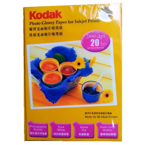This KODAK Photo paper has the below features: It is compatible with any or all inkjet printers. It ensures that all your pictures are free from smudge. It also resist water making your picture last for a very long time. It gives your pictures glossy and nice touch and look. It has a very high level of photographic quality. It is pure white in nature and dries quickly. It has a very high level of vivid colour quality.It contain 20 sheet of A4 210mm x 297mm.