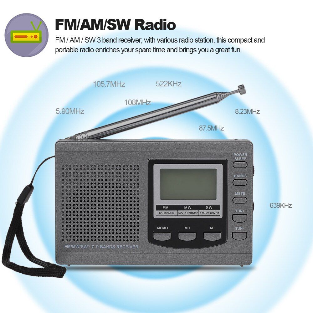 This radio has clear sound quality and is portable.This is a self-powered emergency radio that you and your family can rely on anytime, anywhere. Versatile: weather radio. Keep it with you in case you need it. This lightweight radio is an easy way to listen to important weather or news updates. Place in a suitcase or carrying case, or carry by hand using the attached lanyard. It's even small enough to carry in your pocket. Very small, equipped with a more durable and powerful, can be used for camping, backpacking, hiking or any other outdoor activity. Made of high quality fluorescent aluminum alloy, the appearance is elegant and fashionable. Good sound quality makes you addicted to your favorite music. More convenient to carry, small size, large size, travel essential. Telescopic antenna receiver adopts unique fuselage, superior in quantity and super light in weight. A very handy mini 2 band portable radio that fits easily into a shirt, jacket pocket or handbag. Listen to all your local radio stations for news, live baseball games, talk radio, music of all styles, and more. Easy to use tuning as well as combined rotation power and volume controls. There is a separate band selector switch, so you can easily listen to your favorite radio station. You can put it in your pocket for outdoor activities like camping, hiking, and boating. This can be very helpful if there is an emergency during storm or hurricane season. Radios come with built-in speakers, but they also offer standard headphone jacks as well as smart chrome-plated telescopic antennas for best performance.