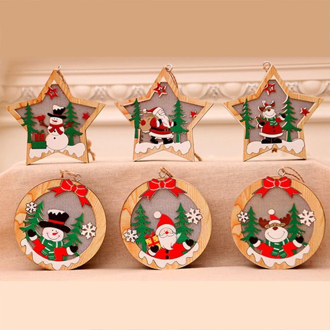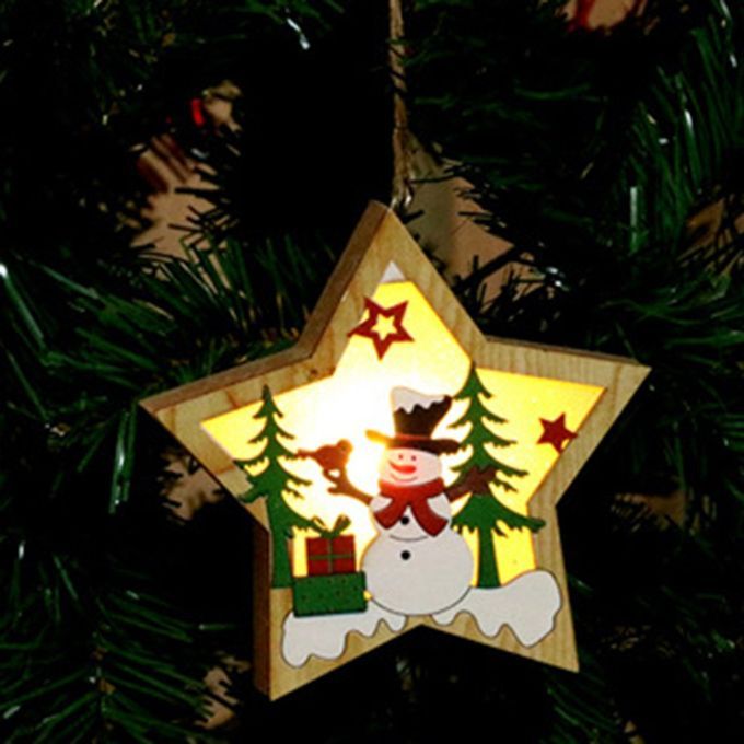 Spe ifi ations: ategory: Luminous wooden pendant Style: Five-pointed star/round Size: Five-pointed star style: 11 m in diameter and 3 m in thi kness Round style: 9.6 m in diameter and 3 m in thi kness Material: wood Pattern: Old Man/Snowman/Elk