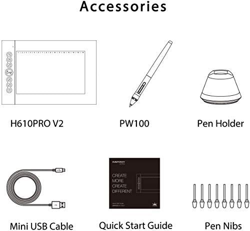 - 10 x 6.25 inh drawing board, so you get more spae to reate or get work done with art tablet . Pen resolution:LPI; Sensing Height:10mm. Newly designed pen holder PH03, it ontains 8 pen nibs and a non-removable pen extrator inside. Can work with many reative software programs like photoshop, Paint tool sai, Illustrator, Clip Studio and so on.