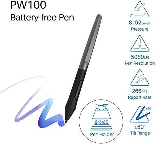 - -free stylus: omes with PW whih no need to harge or battery, you an get rid of any unexpeted interruptions when working with pen tablet. 2 buttons on the pen an be ustomizable. levels natural tilt reognition offer more natural ontrol and preision . 8192 levels of pressure sensitivity- the lines transition from thin to thik will be fluid and preisely as you intended.