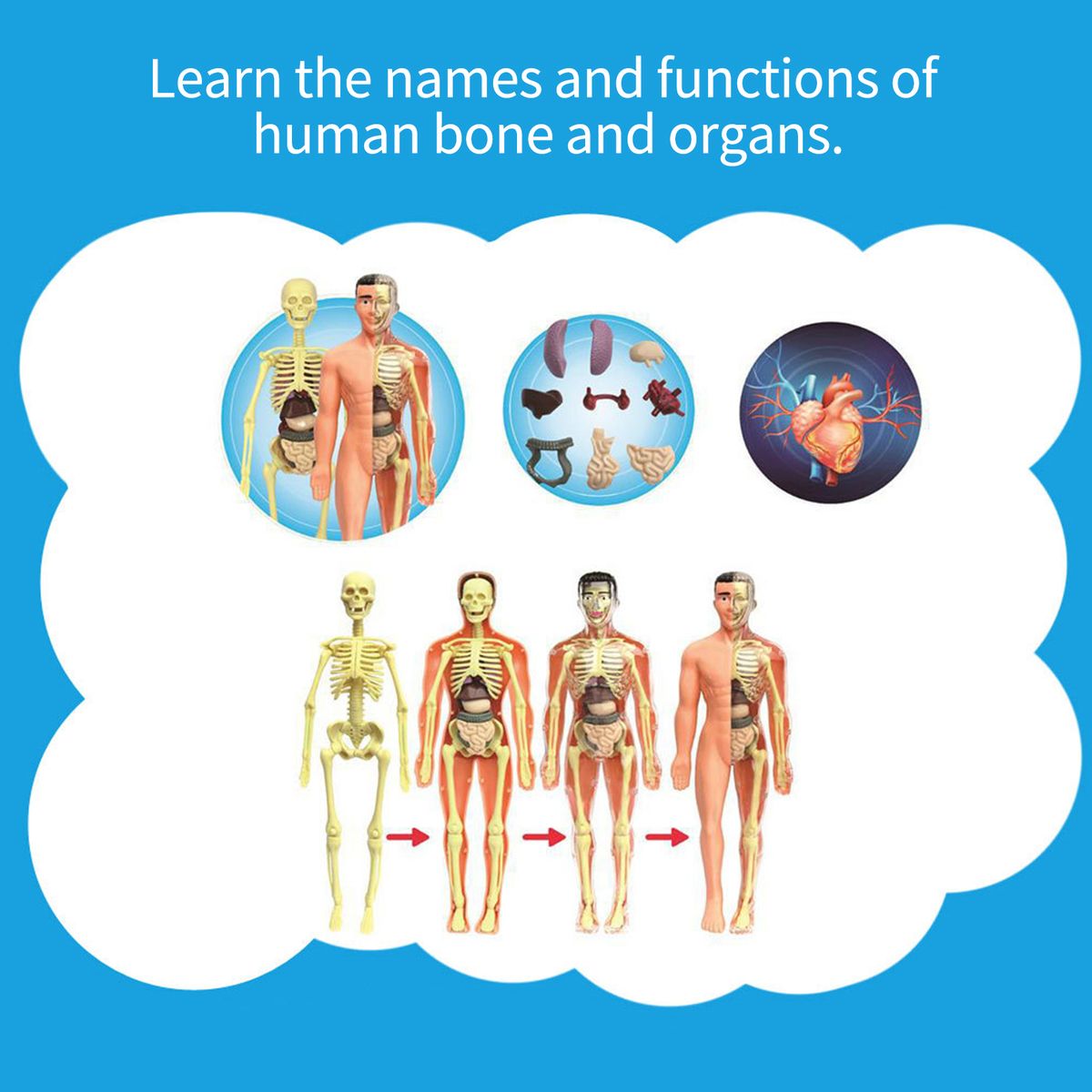 Simple assembly method, play and learn. Learn the names and functions of human bone and organs.