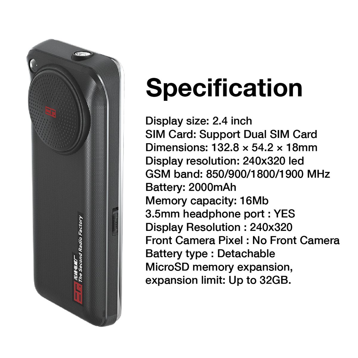 | Display size: 2.4 inch | SIM Card: Support Dual SIM Card |
