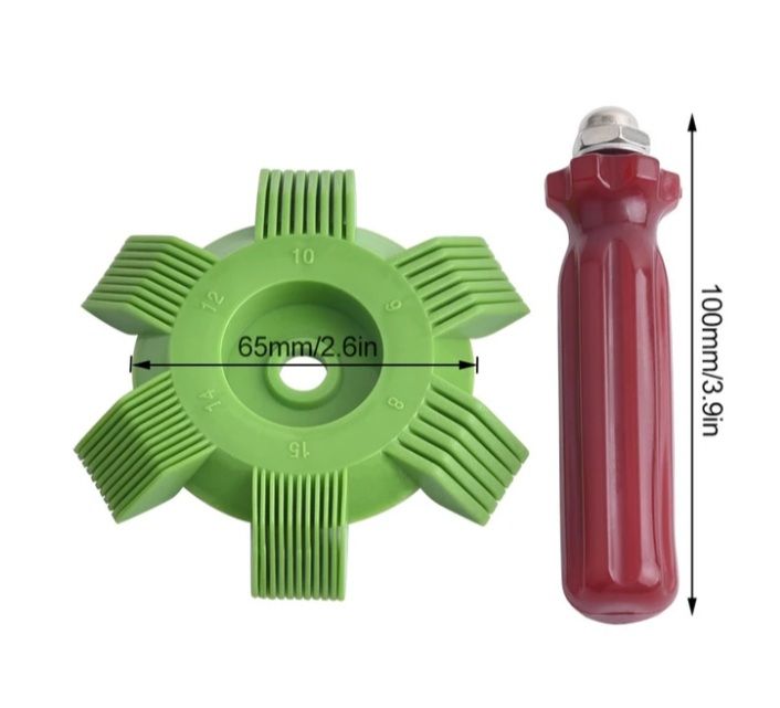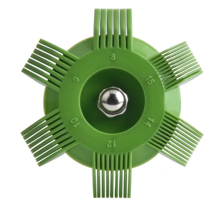 Fin comb tools may come with single, multiple or interchangeable heads that have different fin comb sizes and counts to best match the coil fin size of the repaired unit. Our six-sided head models will work for 8, 9, 10, 12, 14 and 15 fins per inch coils. The comb is carefully drawn across the bent coil fins straightening them out in the process