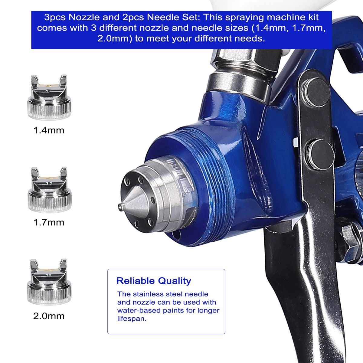 3pcs Nozzle and 2pcs Needle Set: This spraying machine kit comes with 3 different nozzle and needle sizes (1.4mm, 1.7mm, 2.0mm) to meet your different needs.