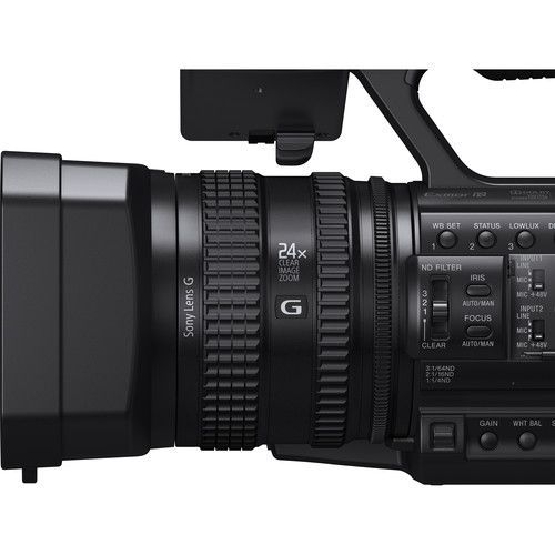 HXR-NX100 Full HD NXCAM Camcorder from Sony brings high-quality performance, adaptability, and ease of use to a compact, handheld body. The camcorder features a single Exmor R sensor with Full HD 1920 x 1080 resolution, Sony G lens with 12x optical zoom range, and a 24x Clear Image Zoom. The integrated zoom lens features individual lens control rings for focus, iris, and zoom. The lens can be used in either full-auto mode with servo control, or as a completely manually operated lens.