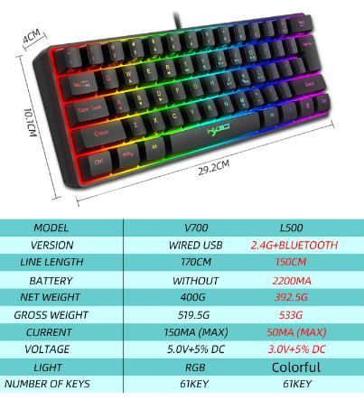 HXSJ Gaming Keyboard 61 Keys RGB Backlit 60% 60 Business Keyboard US Wired Wireless Bluetooth Mini Compact PC Gamer MAC PS4