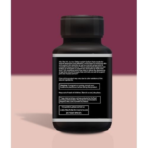 - Ingredients : Hyaluronic acid (sodium hyaluronate), sunflower lecithin, salvia hispanica (seed) powder, microcrystalline cellulose, vegetable cellulose (capsule), vegetarian leucine.