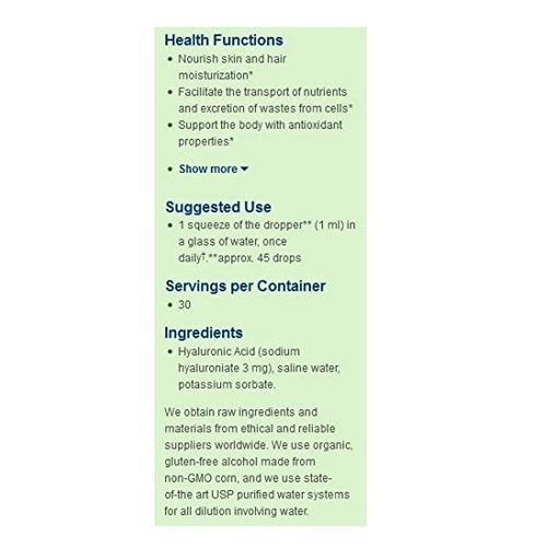 Hyaluronic Acid (also known as Hyaluronan or HA) is a naturally occurring gel-like substance that provides cushioning, lubrication, and flexibility in our bodies, but unfortunately, becomes less available in our older years. The decrease of HA can lead to symptoms of aging in our skin, joints, vision, and overall health. BioPure Healing Products, provides a natural, effective dietary supplement of Hyaluronic Acid that supports the body's native mechanisms to help us look and feel younger longer. BioPure's Hyaluronic Acid liquid is offered in a 4oz bottle with a dropper for easy dosage. Hyaluronic Acid is a glycosaminoglycan, or GAG. Its structure is that of a long linear chain of repeating pairs of carbohydrate molecules. BioPure Healing Product's Hyaluronic Acid has a molecular weight of 1.5 to 2 million Daltons (a unit used for measuring atomic mass). It is delivered orally as a liquid solution of sodium hyaluroniate (3 mg). Other ingredients are saline water and potassium sorbate. * Our products are not intended to diagnose, treat, cure or prevent any disease and are designed to be used as part of an overall health plan with your authorized healthcare provider. Individuals taking food supplements or have an underlying health condition should consult with their authorized healthcare provider before using these products. We suggest that you consult your authorized healthcare provider if you have any health problems and require a medical diagnosis, medical advice or treatment. Statements herein have not been evaluated by the FDA. We do not recommend any of our natural products to be used for small children without the guidance of a licensed healthcare provider. We do not recommend that any of our products be used while breastfeeding, while pregnant or trying to become pregnant.