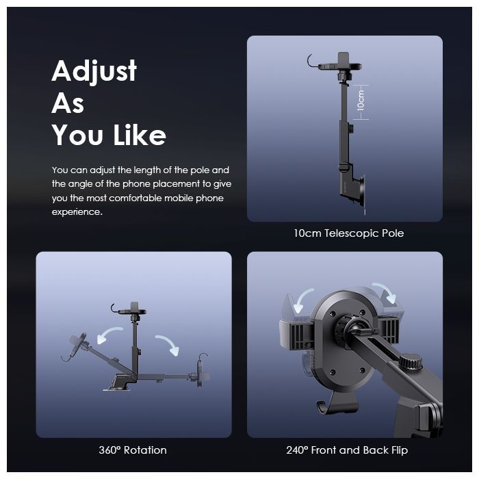 You can adjust the length of the pole and the angle of the phone placement to give you the most comfortable mobile phone experience.
