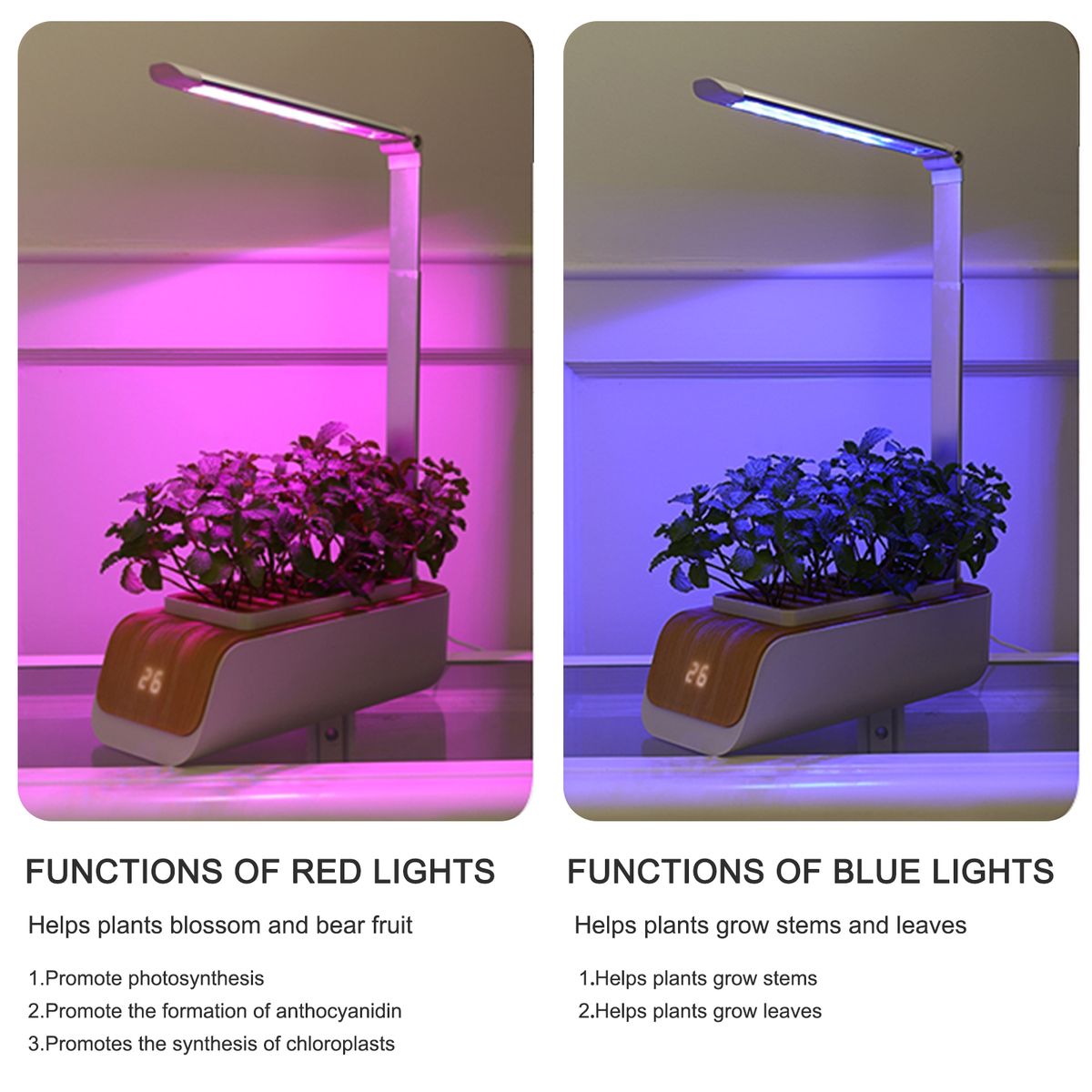 This smart planter have blue light and red light, which has different effects on plants.