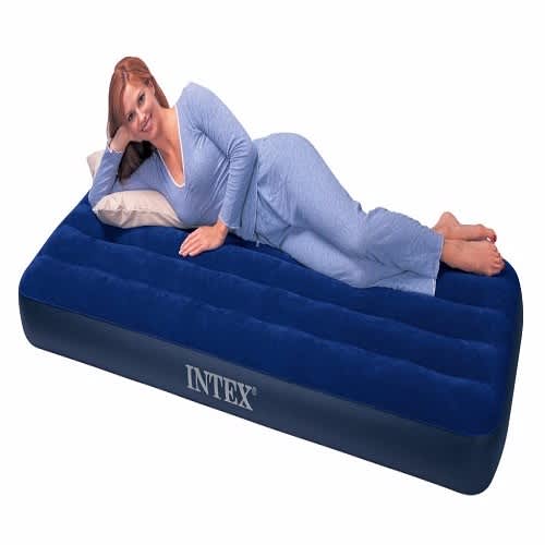 Intex Queen Size Classic Downy Airbed Set with Double-Quick air pump and two pillows. With plush flocking on the top, this airbed gives a more luxurious sleeping surface and helps keep bedding from slipping. Flocking cleans easily and is waterproofed for camping use. The wave beam construction provides a uniform sleeping surface. Crafted with cozy flocked tops and heavy gauge vinyl that is durable and easy to maintain. Box Contains 1 x Airbed pump 2 x I-Beam pillows