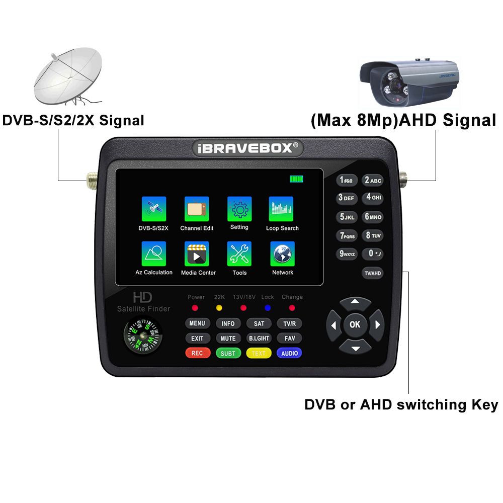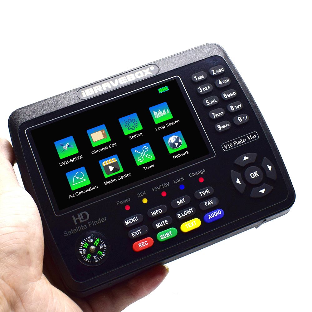 6. Supports DISEQC 1.0/1.1/1.2, Unicable, 0/22kHz Tone,Auto Calculate Angle of AZ,EL. Support compass function,Speaker Integrated. LNB short protect.