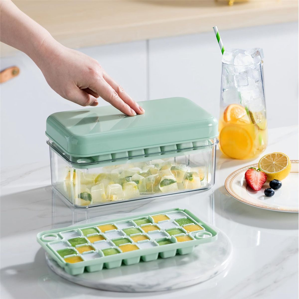 Ice Cube Tray with Lid and Bin: Keep your ice cubes and organized with our ice cube tray, complete with a lid and bin. Our new and improved design makes it easy to remove ice cubes with a simple press, so you'll never struggle to get those cubes out again.