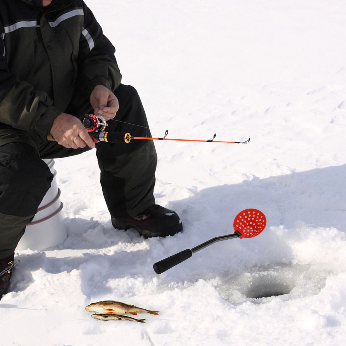 Features:This complete fishing combo includes a fishing rod, fishing reel, ice skimmer, and various fishing accessories, which increases your chances for success on ice fishing.