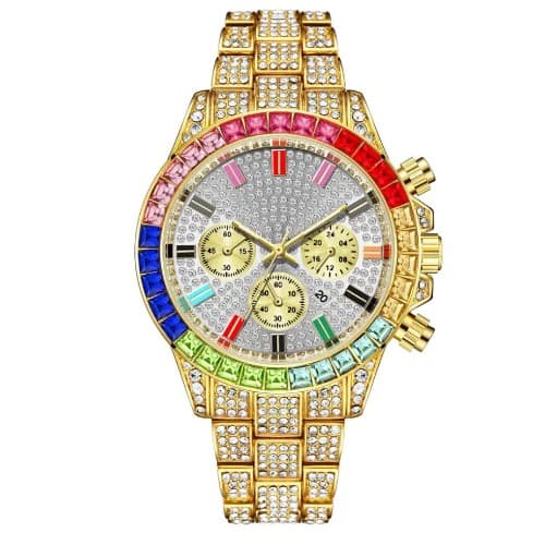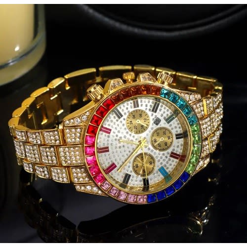 This watch is a super flashy, highly polished, 14k gold plated, ice stunned wristwatch with roman numeral iced out. This product was made to fit your flashy outfit or rich wear.Truly made into a masterpiece, crystal studded watch is customized to the fullest. Round watch in silver tone finish, featuring 28 white crystals at bezel. Its Unique Round Watch Case is inspired by what all rappers are wearing!!