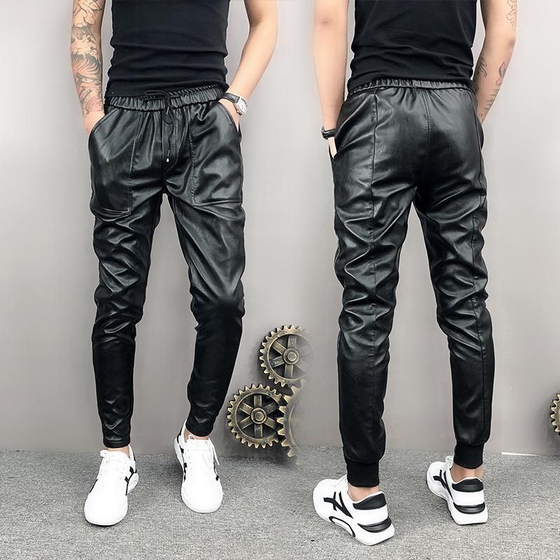 1X Idopy llegada de un nuevo Otono Invierno hombre coreano Hip Hop de cuero pantalones de Harem con cordon ajustable elastico en la cintura de cuero de la PU de larga