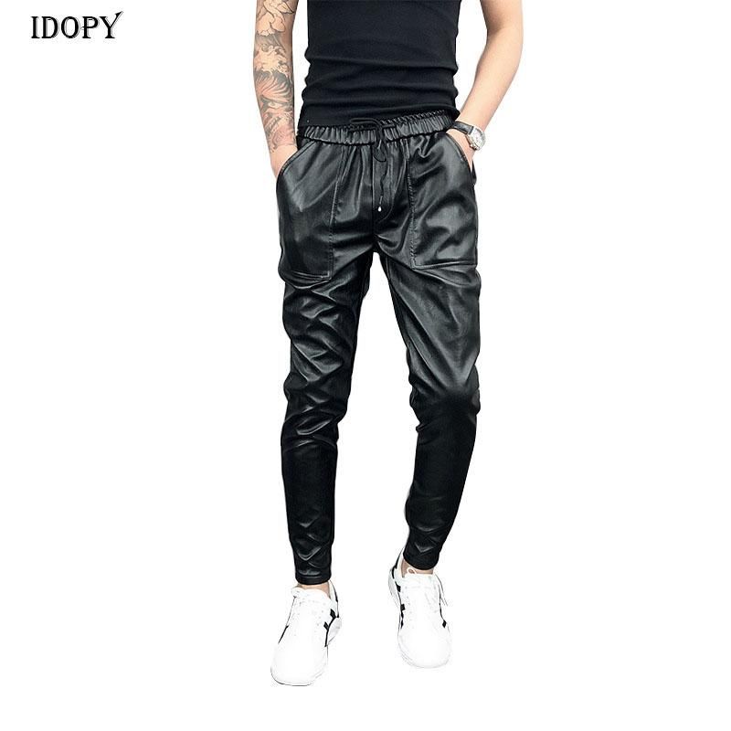 Idopy llegada de un nuevo Otono Invierno hombre coreano Hip Hop de cuero pantalones de Harem con cordon ajustable elastico en la cintura de cuero de la PU de larga