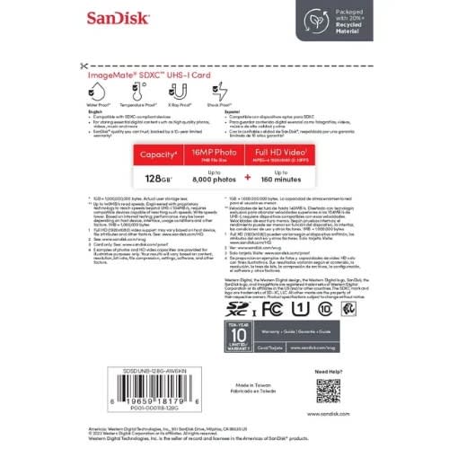 Fast to take better pictures and Full HD videos with your compact to mid-range point and shoot cameras and camcorders. With SanDisk ImageMate UHS-I cards, you'll benefit from faster downloads, high capacity, and better performance to capture and store high-quality pictures and Full HD video. Take advantage of ultra-fast read speeds of up to 120MB/s to save time moving photos and videos from the card to your computer. SanDisk ImageMate UHS-I cards are waterproof, temperature proof, X-ray proof, shockproof, and compatible with SDHC and SDXC digital devices.A great choice for compact to mid-range point and shoot camerasUp to 128GB capacity options to store tons of pictures and even more Full HD videoExceptional video recording performance with UHS Speed Class 1 (U1) and Class 10 rating for Full HD video (1080p)Resistant to water, temperature fluctuations, X-rays, and shocksFor products sold after 06/12/23 read/write speeds may vary.
