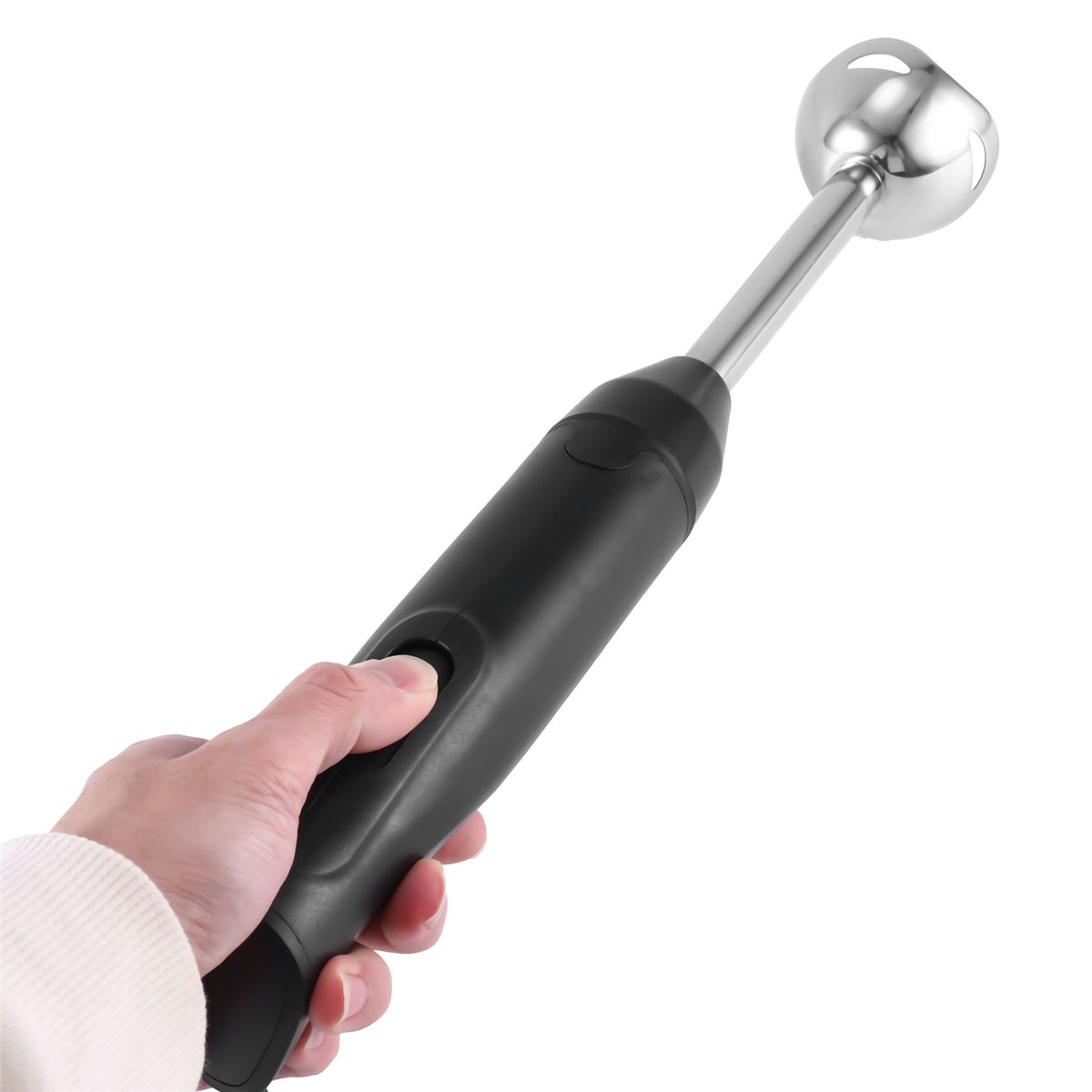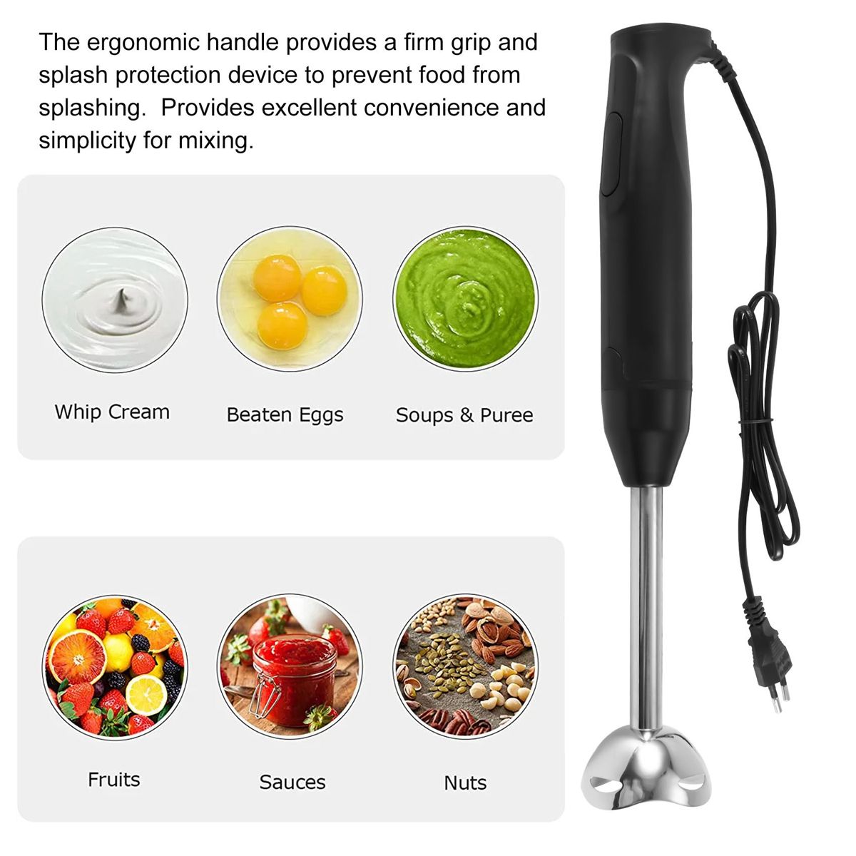 Stylish stainless steel panel: The ergonomic handle provides a firm grip and splash protection device to prevent food from splashing. Provides excellent convenience and simplicity for mixing.