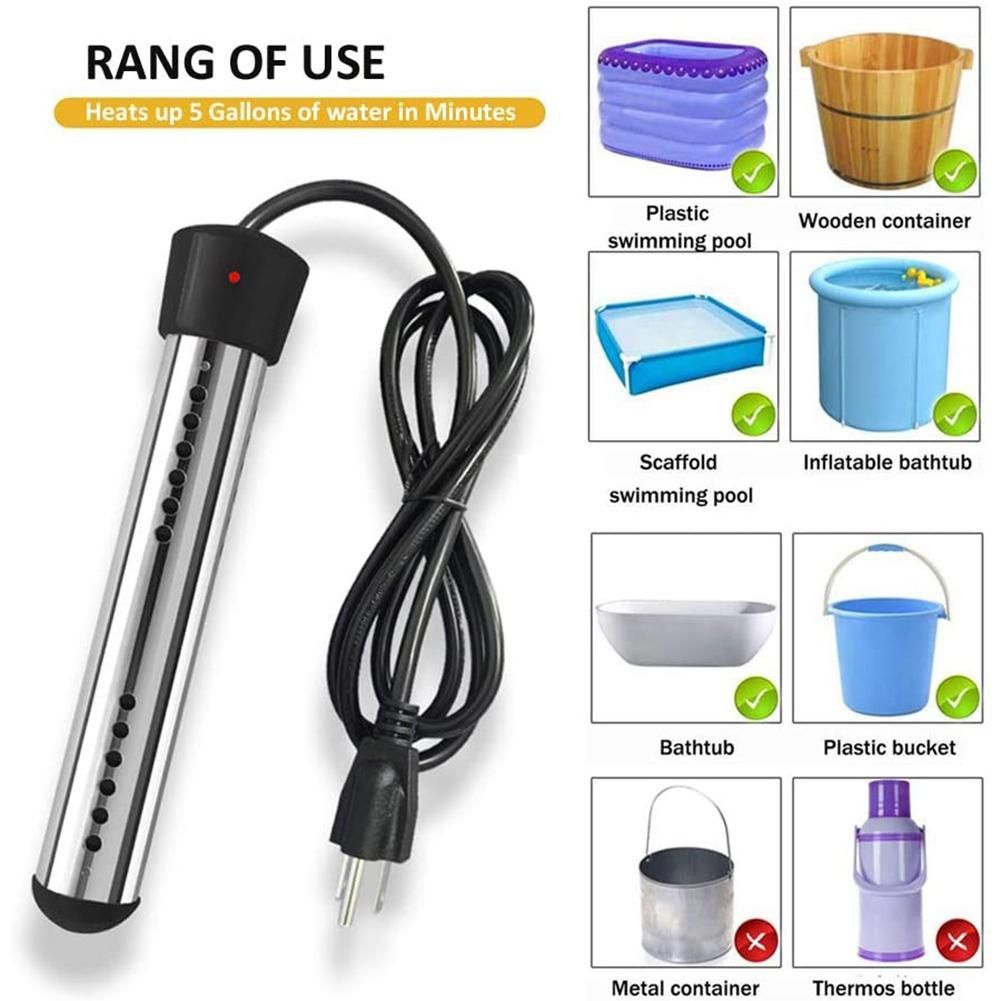 Detailed Information About The Product:1500W High Power: The electric water heater was used for water only, heats 5 gallons of water in a few minutes, the portable immersion heater will heat water forward to boiling when you plug in (It can't boil water), just make sure the water always fully covered the pool heater.Wide Applicaiton: The instant water heater can be used in buckets, basins, bathtubs, mini inflatable swimming pools, etc. and the immersion heater is convenient, portable and suitable for travel, it is an Perfect tool for winter job.304 Stainless Steel Guard: The immersion water heater uses 304 stainles steel guard cover at the bottom. electric bucket heater protects the heating elements from contacting persons or animals directly. The holes on the guard help release heat into the water faster. the cord and plugs with UL Listed, more safer.Simple Operation: Immerse the electric pool heater into water below the watermark on the cord, plug the heater into socket. Check red power indicator light to make sure the water bucket heater is on. then the portable water heater starts working. You can know the water temperature via attached device, and then remove the plug from socket when temperature reach your requirement, take out the immersion heater.Attenion Before Using: The submersible water heater must be completely immersed in water completely during working! Please take out the portable outdoor heater before Pressing the water! Please do not use swimming pool heaters for more than 3 hours! Please do not plug two water heaters into a same socket to avoid fire. The cord and handle can't be submerged in water, there is a lowest watermark for reference on the cord.Plug Type:US Plug,it applies to Canada, India,Mexico, Thailand, the United States, the Philippines,Taiwan and so on.size:26 x 5 x 5cmMaterial:stainless steelcolour:blackPackage Contents:1 x heater 1 x Only the above package content, other products are not included.Note: Light shooting and different displays may cause the color of the item in the picture a little different from the real thing. The measurement allowed error is +/- 1-3cm.About UsWe provide the good product with the best price,we support Wholesale/Drop Shipping Order1. For Drop Shipping order, please remark"dropshipping order", we will prioritize it.2. For Wholesale/Drop Shipping orders, if you have any ideas about the price or package,please contact us in advance,we will give you the best service to satisfy your demands.About Shipments1.We will send out the orders ASAP once your payment is completed normally.2.Please write your complete delivery address with correct phone number and zip code, especially please confirm your full name.About After-sale ServiceWe are reliable seller and we have our professional after-sale service for all of our customs. If there is any question about the order,please contact us in advance ,we will always here until you get a happy answer.About Feedback1. Please check the package and item when you get carefully to make sure there is no problem.2. If you have any problem or are not entirely satisfied with your package,please don't be hesitate to contact us first before leaving negative feedback. We will resolve the problem to satisfy you.3. If there is no problem, please leave us five star positive feedback.Your affirmation is our greatest motivation ! !