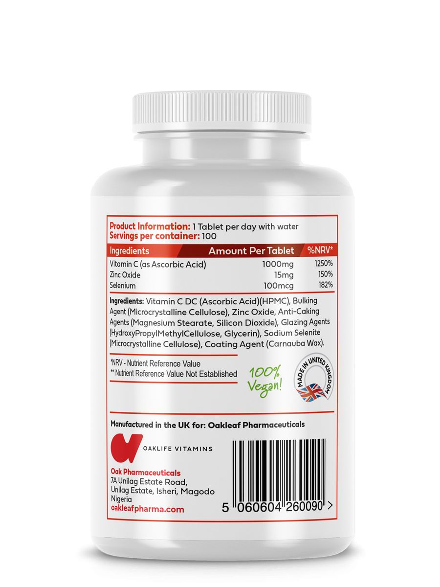 <strong>Ingredients </strong><br />Vitamin c(ascorbic acid) bulking agent(microcrystalline cellulose), coloring agent (nutrafinish orange(polyvinyl alcohol, titanium dioxide, polyethylene glycol/macrogol, talc, iron oxide yellow, iron oxide red), zinc oxide, anti-caking agent (Magnesium stearate, silicon dioxide), sodium selenite. <strong>Caution </strong> <ul> <li>Suitable for those from 8yrs and above</li> <li>Food supplements should not be used as a substitute for a varied and balanced diet and healthy lifestyle</li> <li>Always consult your healthcare practitioner before taking food supplements especially if you are pregnant or breastfeeding, if taking medication or if you have an existing medical condition</li> <li>Discontinue use and consult your healthcare practitioner if any adverse effects or reactions occur</li> </ul> |