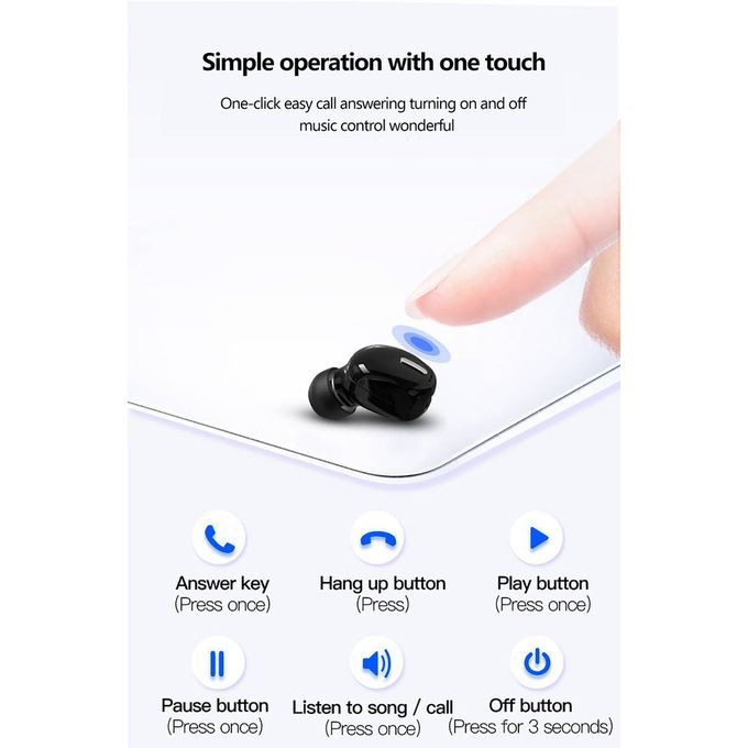 Features: 1. Wireless 5.0 main ontrol : This produ t is a wireless 5.0 main ontrol that su orts hands-free data onne tion within 10m. 2. Built-in DSP audio pro essing system: The built-in audio pro essing system of this produ t an eliminate noise and e ho, ensuring lear ommuni ation and musi . 3. r Mini design: This produ t is small in size, light in weight, the earphones are hidden in the ears, light and invisible design. 4. Safe battery prote tion: This produ t has a safe battery prote tion fun tion to ensure a working time of up to 5 hours. 5. General: The headset is onne ted to two wireless devi es at the same time: su h as mobile phones, P s, PAD and other devi es for alls, musi , games.