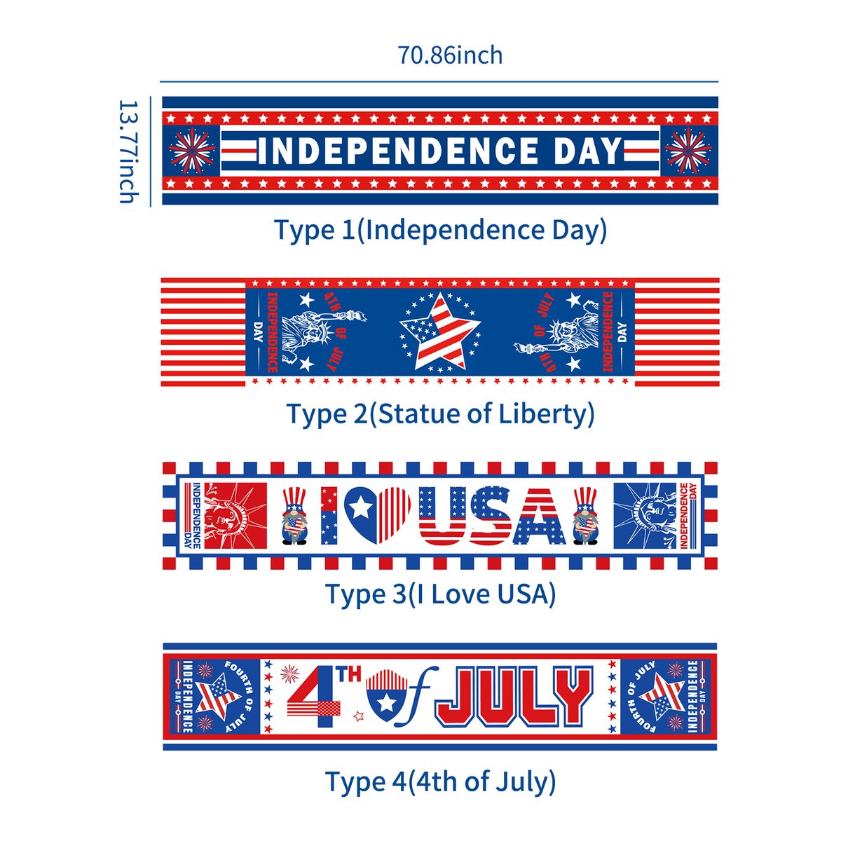 Pattern: Type 1(Independence Day); Type 2(Statue of Liberty); Type 3(I Love USA); Type 4(4th of July) (Optional)