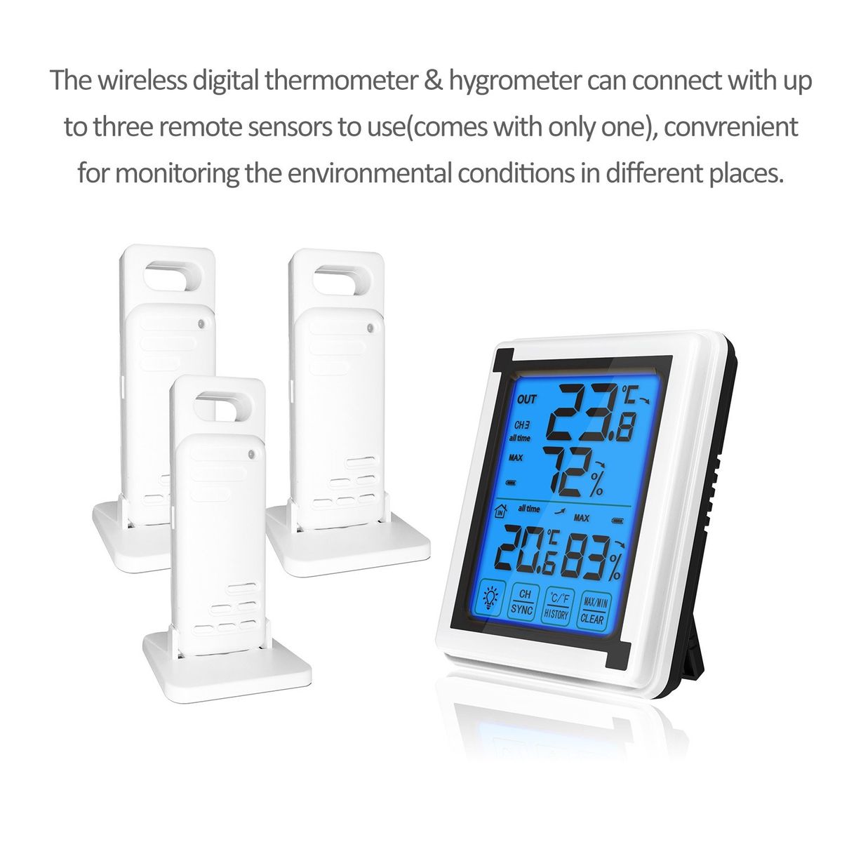 Comes with a remote sensor for wirelessly tracking indoor or outdoor temperatures, and it can transmit the readings to the connected digital thermometer amp; hygrometer by using a 433 MHz wire-less signal. Up to 60M/200FT transmission distance.