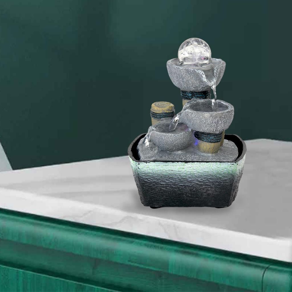 Exquisite miniature fountain: approximately 6.3 inches (16 cm) high, 5.5 inches (14 cm) long, 3.94 inches (10 cm) wide, perfect for decorating any table, desk, bathroom sink. It features three tiers of waterfalls and rocks.High quality material: made of high quality resin material, environmental friendly and durable.Color-changing LED light and Rolling Ball: The LED lights are built-in to illuminate the water fountain. Including a quiet submersible pump to circulate the water and provide the soothing water sounds for relaxing. Easy installation and maintenance: This fountain requires no additional or plumbing to use. Plug the Power cord into an outlet and turn Your Fountain on; When you want to turn it off, just flip the switch.Enjoy the atmosphere of water: enjoying the tranquility in a dimly lit room or on a table outside the terrace at night, enjoying the soothing sound of water is a sensory experience that makes you feel like you are in nature.