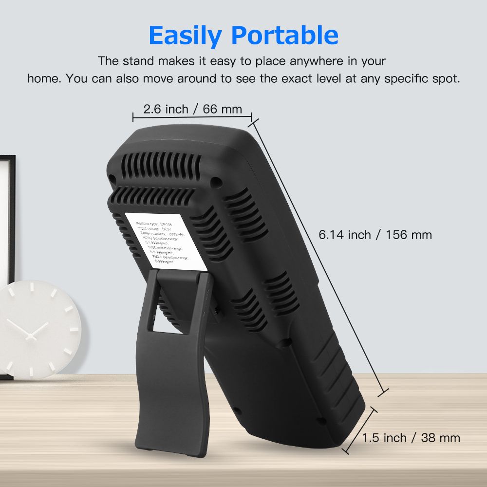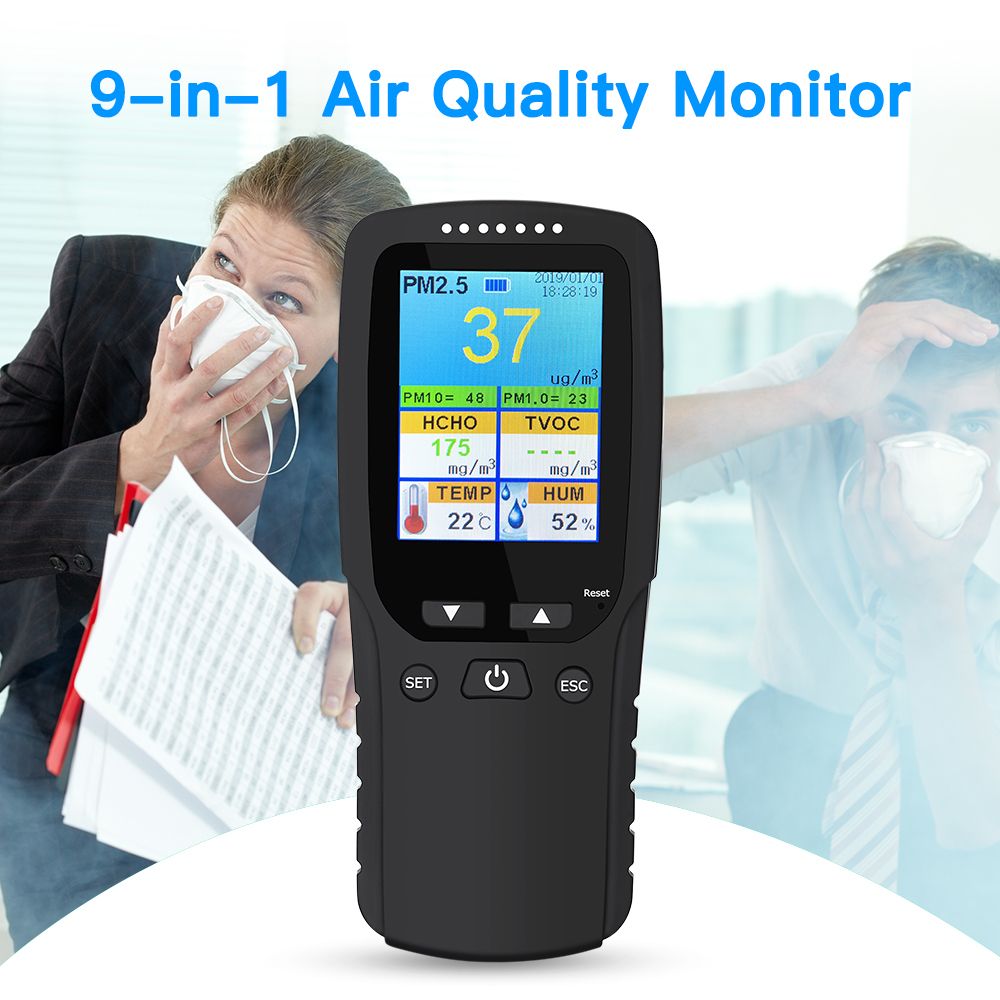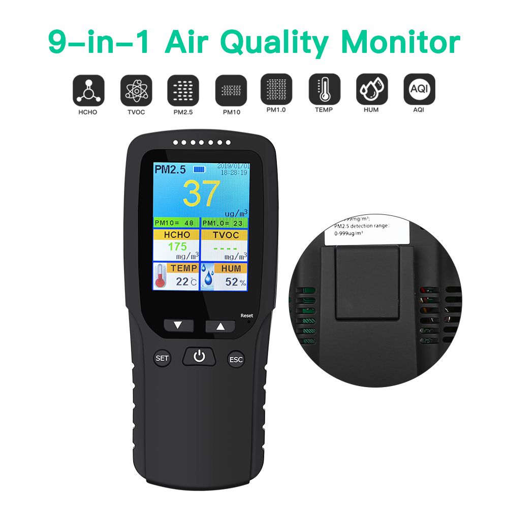 Features: 【9 in 1 MULTIFUNCTIONAL AIR QUALITY MONITOR 】 New 2020 upgraded indoor air quality monitor that can accurately aees multiple measures of air quality including concentrations of formaldehyde (HCHO), PM2.5, PM1.0, PM10, HCHO, TVOC, temperature, humidity, AQI, Date/Time. It's very neceary for you to know the air quality of your living place 【PORTABLE AIR DETECTOR】 Spot check indoor air quality anywhere or leave device on for continuous monitoring ,This easy-to-carry air quality detector can help monitor air quality at home, kitchen, bedroom, office, school, car, hotel, travel, campingetc...especially in which has baby,child and pregnant woman. 【EASY OPEARATION】 This air monitor is easy to operate with just preing the functional on, Updated user manual is very simple and easy to understand. The intelligent air tester can monitor the variety of the envment in a period your care about,You can take it anywhere to monitor air quality. At the same time, you can set a standard value of formaldehyde. If the density is higher than standard value, the device will alarm. 【PORTABLE & USB 】 It's easy to carry the intelligent air quality monitor that can help us detect the gas air pollution in household, kitchen, bedroom, office, school, car, hotel, travel, camping, party etc...especially in which has baby,child and pregnant woman. Built with 1000 mAn and packaged with one USB cable, the standby time can last for 8-12 hours 【WHAT'S YOU GET】 Indoor air quality monitor made of ABS material, good feeling, non-toxic, eco-friendly and durable to use. Package Included: 1× Air quality tester, 1× USB cable, 1× User manual. Specifications: Continuous work time:300min Battery:1000mAh polymer lithium battery Input voltage:5.0V/1000mA Charging temp:-10℃-45℃ FormaldehydeTest object range:0-1.999mg/m3 Test tech:semiconductor sensor Sample type:ciffusion type Concentration unit:mg/m3 TVOC Test object:TVOC Test range:0.000-9.999mg/m3 Test tech:semiconductor sensor Sample type:ciffusion type Concentration unit:mg/m3 Test time:5 min PM2.5/PM1.0/PM10 test Test principle:laser light scattering Test particle population:2.5um,1.0um,10um Test particle ma:PM2.5,PM10 Sample time:3 sec Test method:concentration(per liter) Test range:0-999ug/m3 Use envment Air preure:86Kpa-106Kpa Relative humidity:20%-85% Test temp:-10℃-45℃ Storage temp:-20℃-50℃ Package Included: 1x Air Quality Monitor Tester 1x USB Cable 1x User Manual Packing list