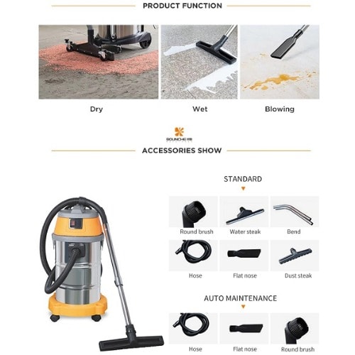 Wet & dry vac provides good service for the careful cleaning of all types of surfaces that are not sensitive to water.Unlike standard suck & wipe techniques, the wet & dry vac provides deep-down and thorough cleaning and is an ideal addition to standard household cleaning appliances when it comes to stubborn and ingrained dirt.A wet & dry vac is ideal for top-to-bottom cleaning of the textile materials found in all kinds of vehicles, be it as seat coverings, roof linings, mats and interior trim.The sucked up dirt is collected in a rust-proof and sturdy 30 liter stainless steel tank, and a practical water drain screw on the tank provides a convenient way to get rid of the absorbed water.For easy mobility during use there are large wheels and castors.There is a blow connection for cleaning hard-to-reach areas too, such as under staircases.For use in the workshed there is an integrated automatic coupler socket on the housing for connecting power tools.A cable holder is fitted on the housing.This cordless wet and dry vacuum cleaner comes with a practical holder for its extensive accessories to keep things tidy during operation and storage.Delivery includes a plastic suction hose and two-piece extension tube; this 36mm- & oslash; hose system maintains high air and dirt flow.Delivery includes a floor nozzle for carpets and smooth flooring, a crevice nozzle, a foam filter & pleated filter, plus two brushes and two nozzles specially for cleaning cars.