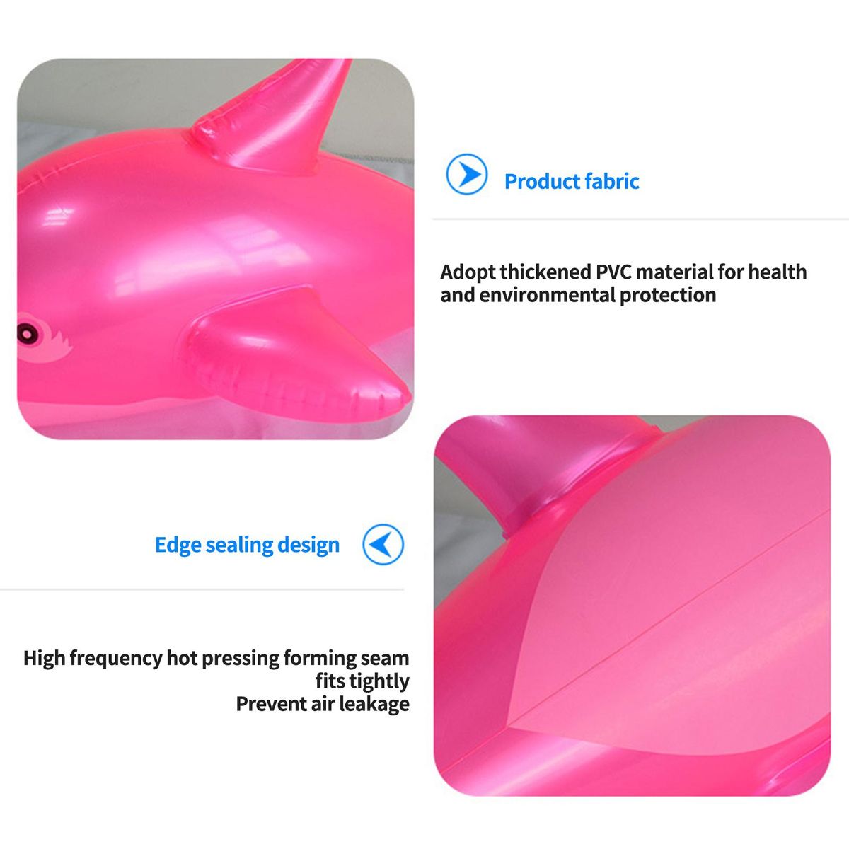 Featuring with high sealing air hole and elastic wear-resisting, the inflatable dolphin fish is long-lasting and explosion proof.